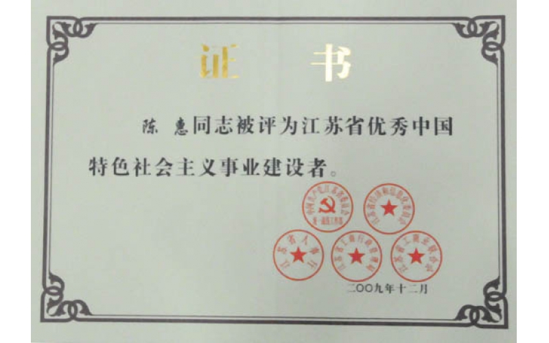 2009年12月,陳惠董事長(zhǎng)榮獲江蘇省第四屆“優(yōu)秀中國(guó)特色社會(huì)主義事業(yè)建設(shè)者”稱號(hào)。